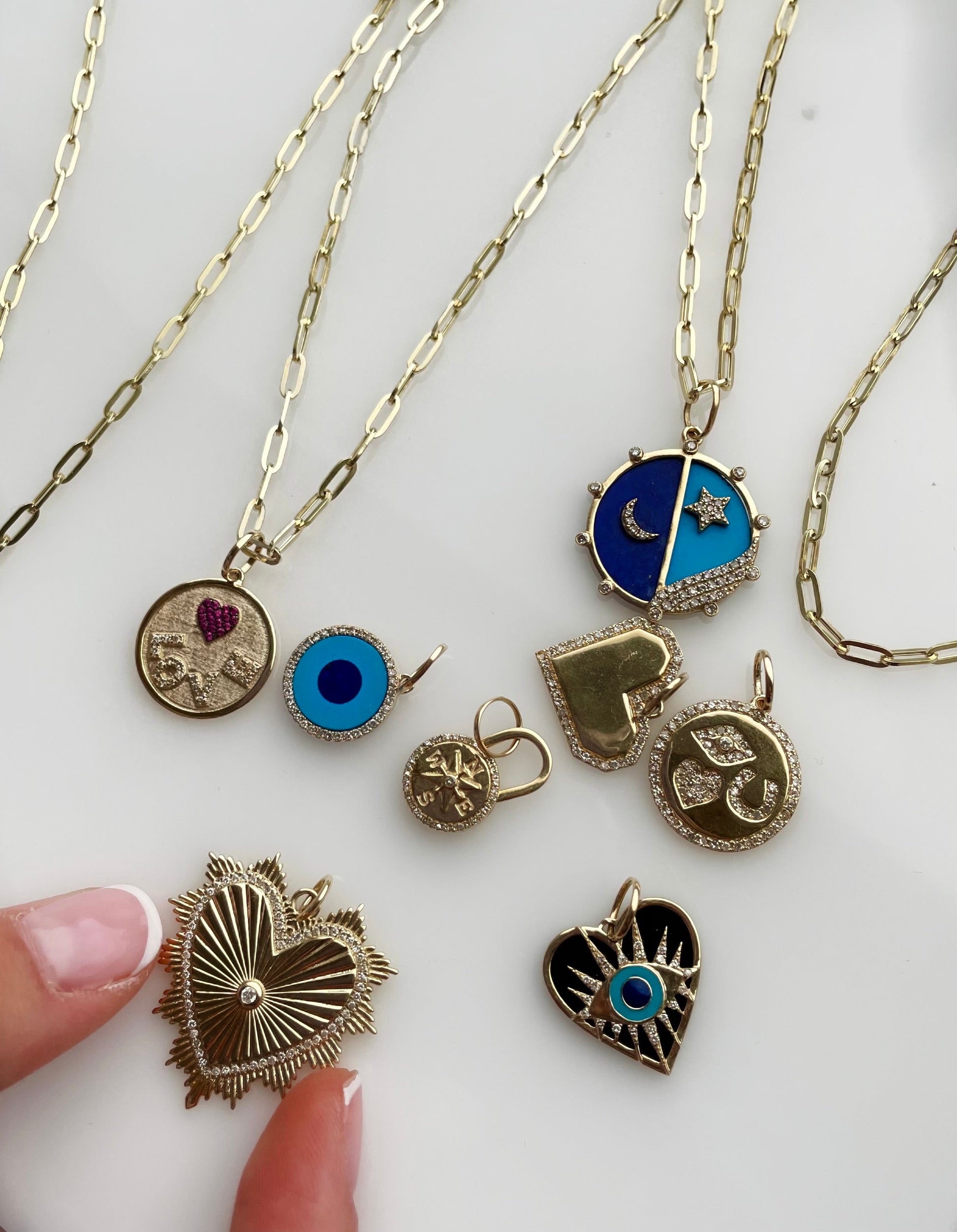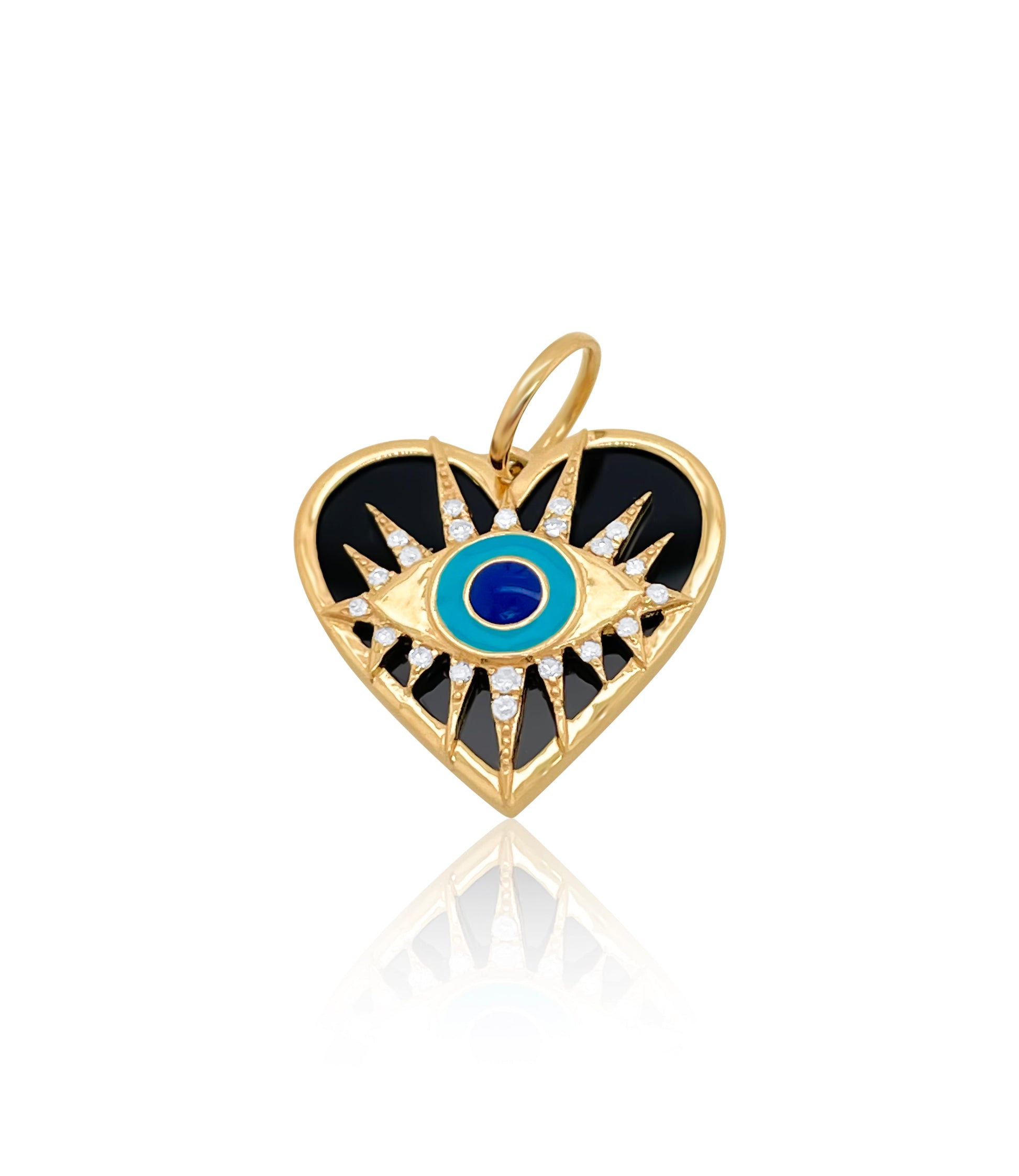 This stunning heart charm is crafted in 14k yellow gold and has a black enamel center