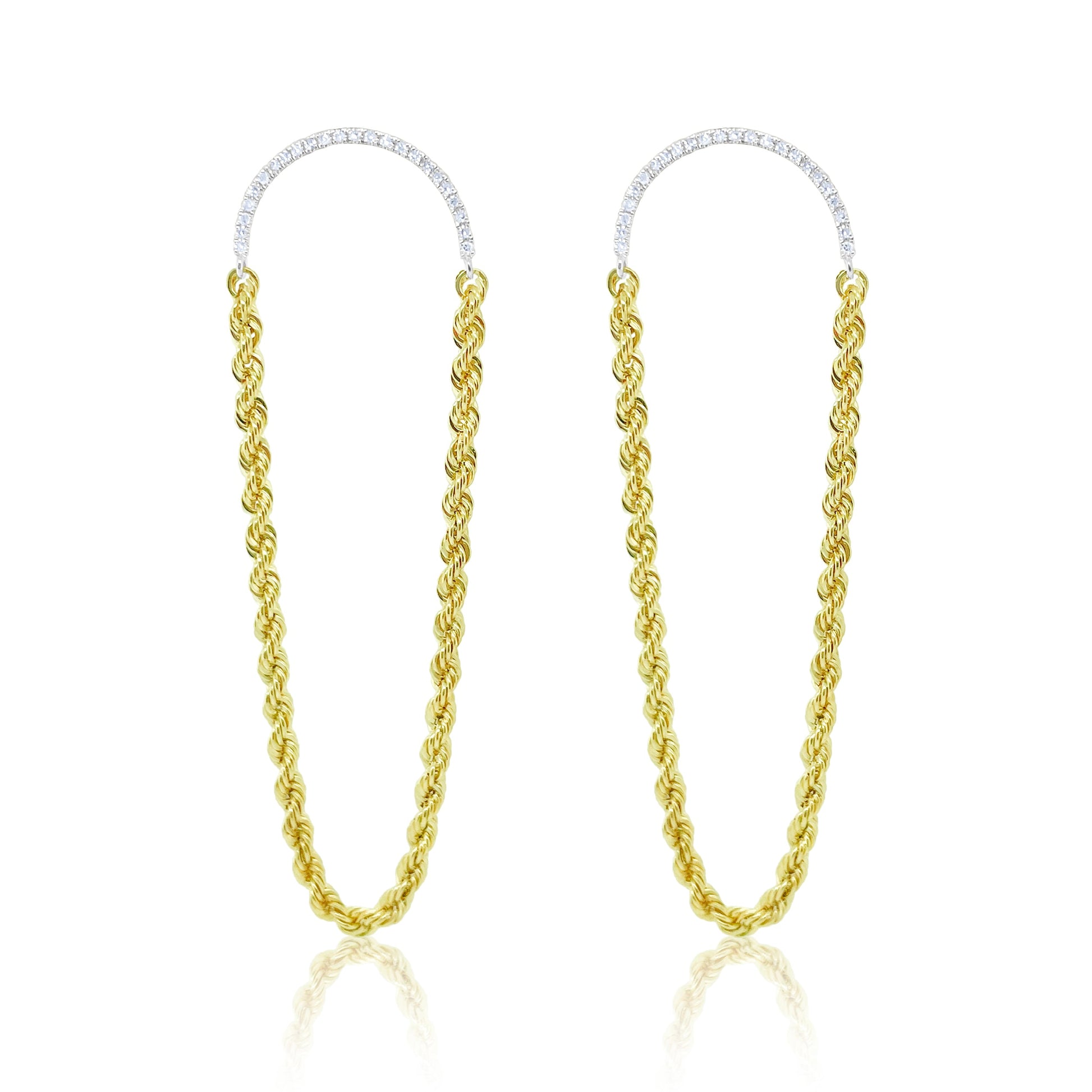 These diamond yellow gold rope earrings feature a stud backing and diamond oval top. The ropes are a flexible chain loop.